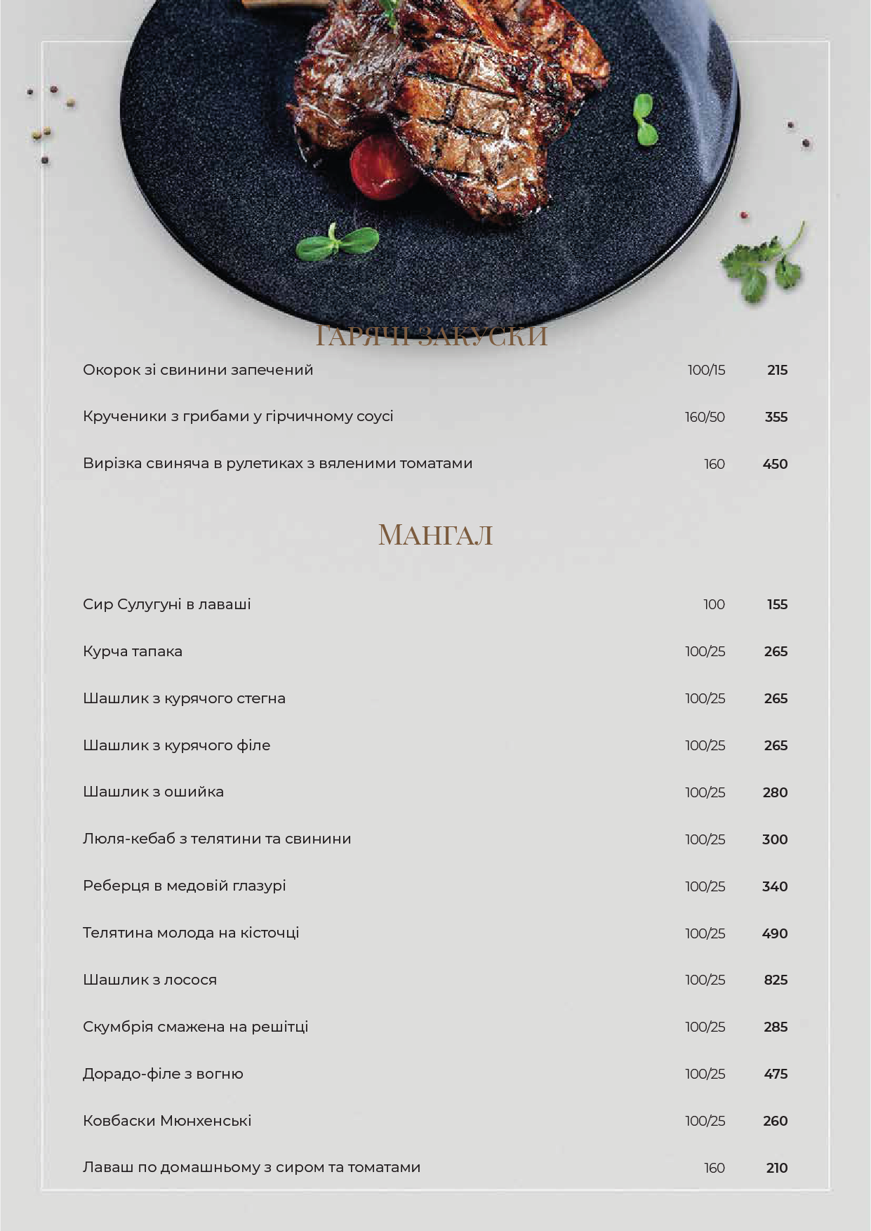 М'ясні антипасті з прошуто з оливами, асорті сира з ягодами та джемом брускети з пармською шинкою, салат з індички під вершковим соусом Дор Блю, садж курка запечена пряним рисом з курагою та родзинками, філе скумбрії під горчичним соусом….