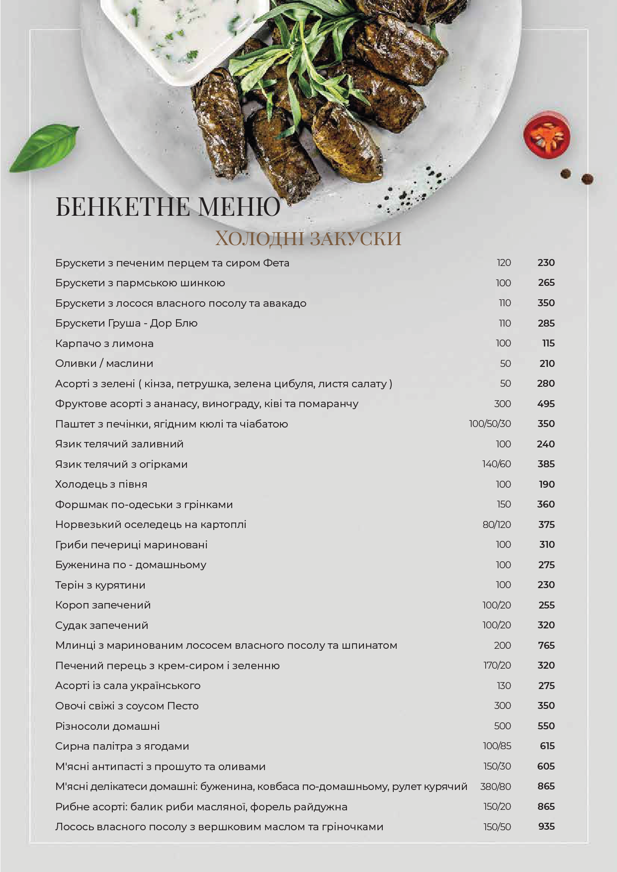 Брускети з лосося власного посолу та авокадо, судак запечений з овочами, салат з качиним філе, яблуками та селерою під помаранчовим соусом, лосось власнго посолу з вершковим маслом, сир Брі з полуницею, італійський салат з овочами, вяленими томатами, Песто, люля кебаб телятина-свинина, дорадо філе гриль…